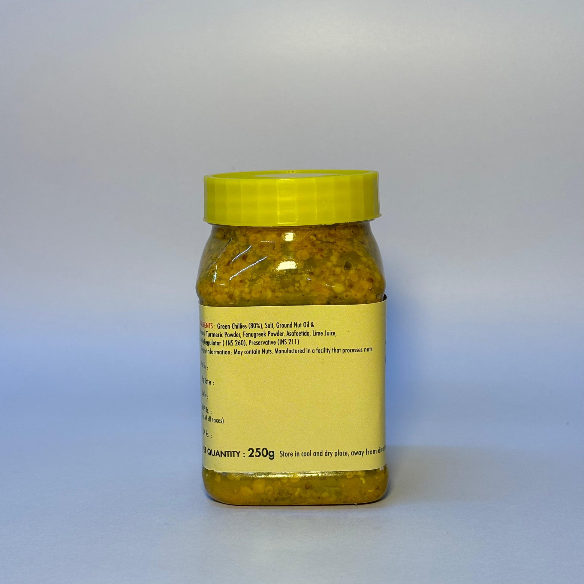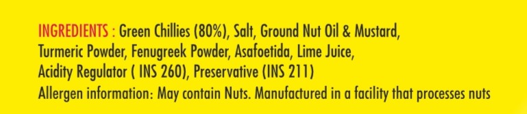Green Chillies, Salt, Ground Nut Oil, Mustard, Red Chilli Powder, Fenugreek Powder, Turmeric Powder, Lime Juice, Asafoetida, Asafoetida, Acidity regulator (INS 260) and Preservative (INS 211).