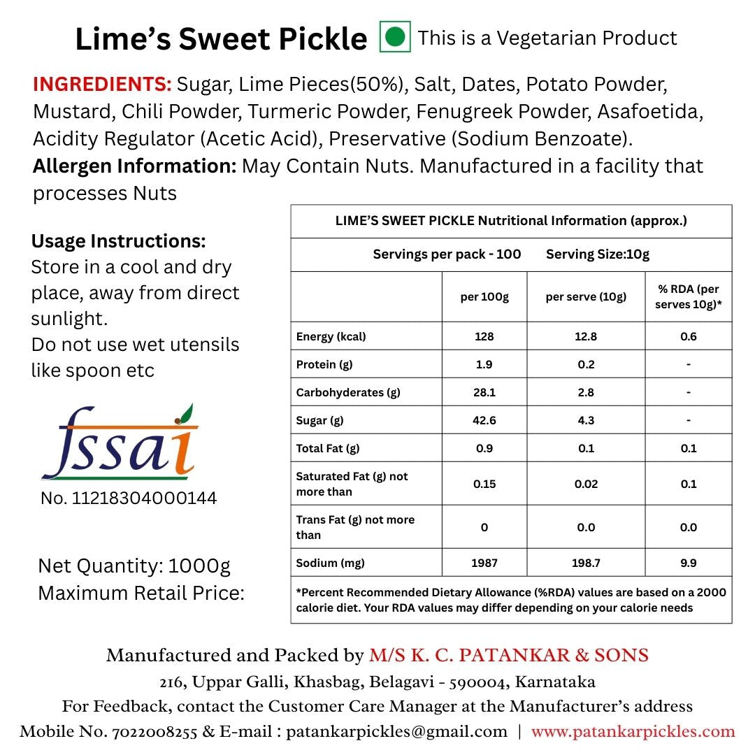 - Preservatives:Our Lime's Sweet Pickle is safely preserved with permitted preservatives -Acidity regulator (INS 260) and Preservative (INS 211) ensuring its freshness and longevity without compromising on taste
